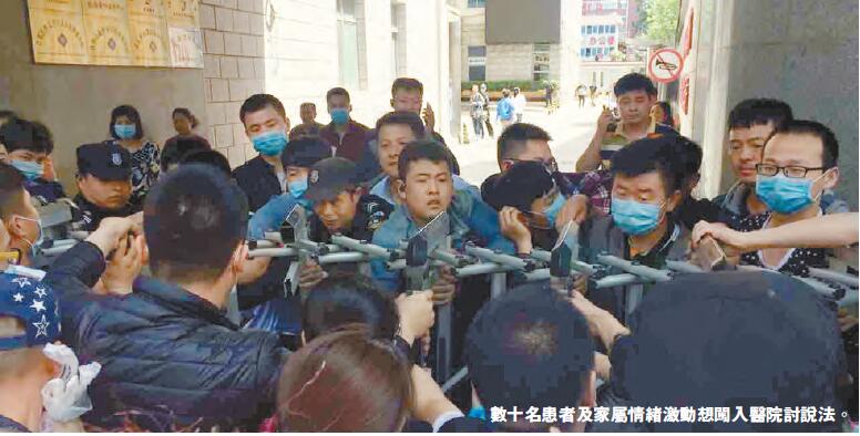 到了11点40分左右,数十名患者及家属情绪激动,齐聚医院大门处,想闯入里面找院方讨说法未果。冲突中,医院伸缩门部分受损,随后被民警制止。院方工作人员称,目前有多个调查组正在医院调查,还没有定性,具体什麽时候给结果他们也不确定,其他不便回应。