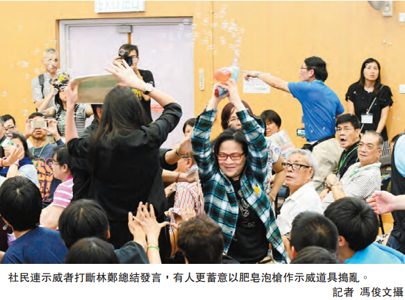 林鄭的言論引起台下社民連副主席黃浩銘不滿,高聲質疑林鄭扭曲「學者方案」,多名社民連成員一同高舉標語,大叫爭取全民退保口號;更有人以肥皂泡槍一邊噴肥皂泡。期間雖然主持多次調停,在場保安亦嘗試勸阻但不成功,最后多位示威者被趕離場。林鄭與張建宗則在未有完成發言下提早離場,亦未有會見傳媒。