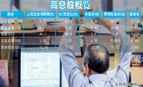踏入5月,短短4天交易日港股已跌個四腳朝天,似乎應驗了「五窮月」說法。在低息環境下,股市又愈跌愈有,想為資產避險兼增值,高息股或者是不二之選。高息股當然離不開高派息率的宗旨,平穩業務表現及股價可追落后,如此選股準則,冠君產業(2778)及香港電訊(6823)值得留意。香港商報記者 林德芬
