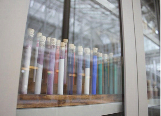 福布斯颜料集中的颜料来自全球各地,其中一些仍然被储存在原始的精美玻璃容器中。图片来源: Jenny Stenger, President and Fellows of Harvard College Khandekar把自己的研究以及对颜料的分门别类描述成了一种类似于侦探的工作。“我们使用的工具,以及使用方法和法医使用的完全一样。”他说,“我们会检查原材料,找出它的主要成分来辨别出它的原产地。”只不过Khandekar和他的团队使用的工具不是DNA分析仪,而是像拉曼光谱法(Raman spectroscopy)、质谱分析、气相色谱分析以及电子显微镜分析等科学技术来精确测量出颜料中的化学成分。