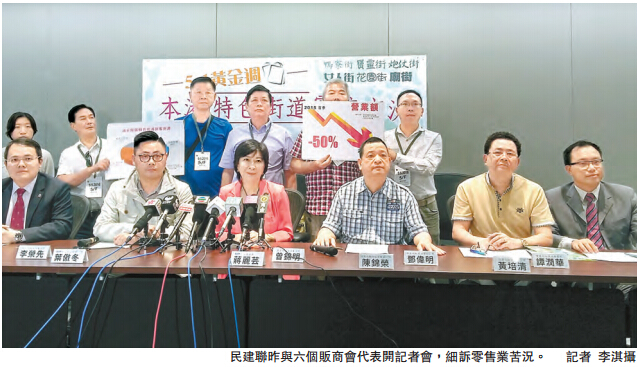 今年五一假期的内地访港旅客人数虽然上升,但经营情况未见好转,旅客人均消费更较去年同期下跌。民建联昨日联同6个小贩商会,包括油麻地庙街贩商会、通菜街(女人街)贩商协会、花园街贩商协会、宝灵街贩商协会;鸭寮街贩商协会和炮仗街贩商协会、以及油尖旺工商联会举行联合发布会,讲述本港多条特色街道的零售市况。