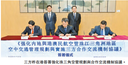 强化三方合作交流机制协议的具体内容包括,三方民航有关领导层每年两次轮流於内地和港澳地区举行高层次会面或电话会议,积极巩固三方就珠江三角洲地区空中交通管理规划与实施方面的密切合作关系,加强领导层沟通和整体协同规划,促进珠三角地区的协作;三方的空管技术人员按议题需要,加强联动,相互借监,多进行更紧密的技术层次会面与交流。