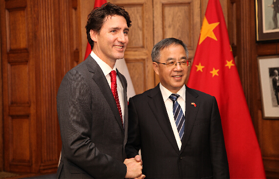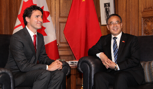 当地时间5月10日,加拿大总理特鲁多在渥太华国会山会见到访的中共中央政治局委员、广东省委书记胡春华。