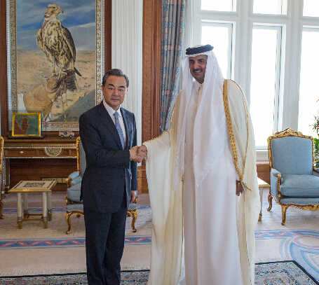 卡塔尔埃米尔(国家元首)塔米姆(右)在多哈埃米尔宫会见到访的中国外交部长王毅。新华社