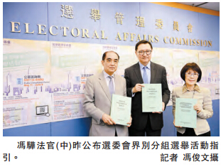 选举管理委员会昨日召开记者会,公布选举委员会界别分组选举活动建议指引,昨日起作公众谘询30日,直至6月9日结束。主席冯骅表示,2016年选举委员会界别分组一般选举,将於12月11日举行;选管会已为这次一般选举及往後举行的补选,制订新的建议指引;是次的建议指引是以现行的指引为基础,再作出适当修改。