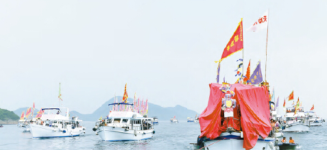 天后座駕船(船頭有紅布神棚)由多艘大小船隻簇擁下進行海上巡遊。記者 周駿攝