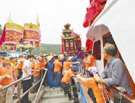 眾善信穩定天后座駕船,請天后鑾輿上船。