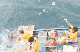 天后座駕船兩旁各有沙艇沿海上燒紙祭品。