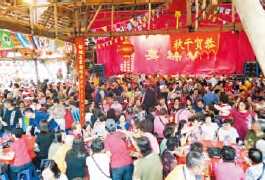 天后出巡後村民和遊人於神功戲棚憑票食盆菜。