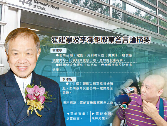 另外,昨日電能實業股東會上,有小股東關注一旦英國下月公投通過「脫歐」,對公司造成的影響,霍建寧回應稱,公司在英國的水務、電力及燃氣項目尚算穩健,「難道(英國人)不喝水不開燈嗎?我并不相信」。