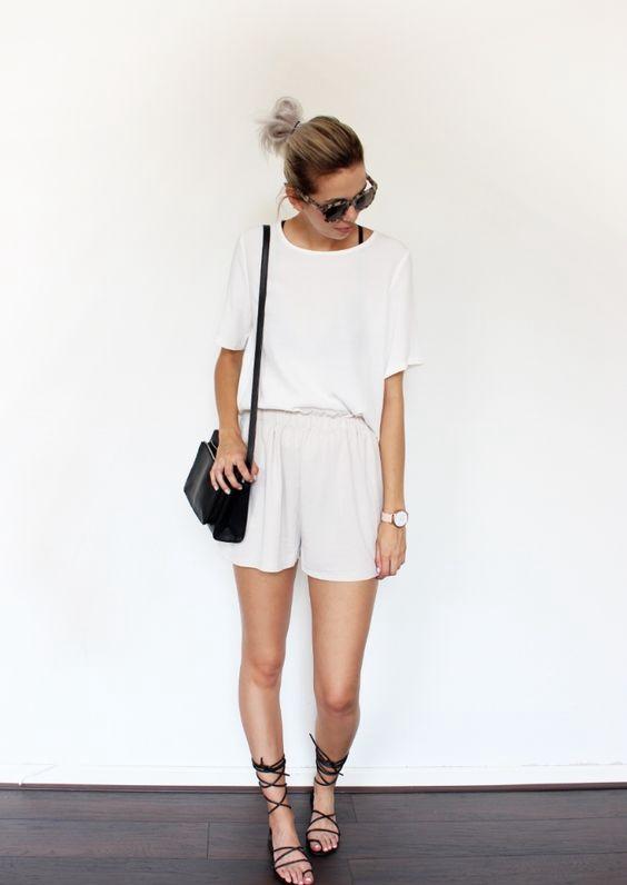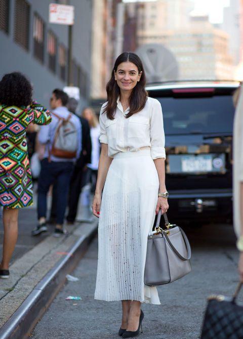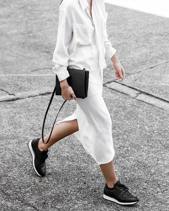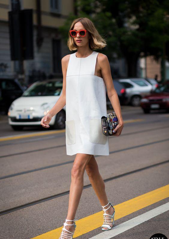 Tips6:商务上衣+白色羽毛短裙 跟上边的搭配有些相反,这身搭配就是上面简洁下面繁复,达人的这身look上衣看起来特别商务,而下边的短裙又显得有些俏皮,整体感觉活泼不失韵味。 Tips7:一字肩+九分阔腿裤 一字肩白色单品简直是少女们的心头爱,夏日炎炎的日子一字肩不仅清凉,还能把自己的性感锁骨露一露,但下装搭配什么通常很苦恼吧?其实一件九分阔腿裤就解决了,或者你可以搭配修身一点的白色长裤。 Tips8:衬衫+百褶裙 最学生范,最简单易得,最不容易穿出错的白色搭配就是衬衫+百褶裙了,这身搭配对身材没有任何要求,但也没什么高级感。 Tips9:T恤+短款裤裙 T恤搭配短款裤裙的这身装扮不能更舒适了,下配一双罗马鞋就很显时尚感,简洁轻便的装扮特别适合周末逛街。 Tips10:白色衬衫裙 衬衫裙是最好穿的单品之一了,可以配运动鞋,也可以配小白鞋,总之,无论你选择什么单品总能跟白色的衬衫裙搭配起来。但是黑色永远是白色最登对的那个cp。 如果你想穿这种衬衫裙,小腿却有点粗也不要紧,一款超长衬衫裙还能穿出来飘逸长裙的感觉,系一个腰带拉长腿部,身材比例好得没的说。 Tips11:超长连衣裙 这种搭配太高阶了,具有模特身材的女孩们可以尝试一下,就单品本身而言很容易被穿出气质,然而小短腿和小肚腩们就不要尝试了,也很容易适得其反。 Tips12:A字裙 这种A字连衣裙瘦人穿了越发显瘦,胖人穿了越发的显胖,但尤其适合孕妇,最大的好处就是宽松舒适,不适合小个子,撑不起来的话会像盖了一个斗篷在身上。 Tips13:A字短裙 小个子们的福音来了,如果说有一款裙型特别适合小个子,那一定是A短裙了,有奥黛丽赫本气质的A字小短裙,搭配上一款高跟凉鞋,1.6米的身材穿出170+的感觉。 Tips14:吊带短裙 这种吊带裙其实也是夏天显清凉的必备单品,而且特别适合小个子,一般大腿二分之一以上的短裙类的都特别适合小个子穿。
