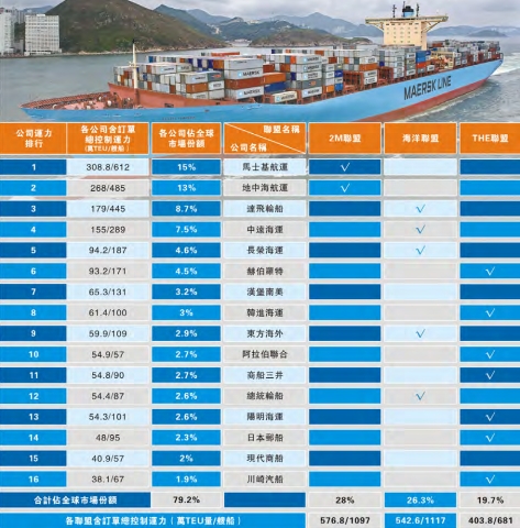 就在4月20日,中遠海運、法國達飛、長榮海運和東方海外共同宣布組建「海洋聯盟」。該聯盟預計明年4月開始運營,至少持續5年,所涉及的範圍包括亞洲往返西北歐、亞洲往返地中海、遠東往返紅海以及遠東往返波斯灣區域、亞洲往返美國西岸/東岸,以及大西洋航線公40條航線,投入350艘船,預計投入運力公約600萬TEU。海洋聯盟總規模超越由馬士基航運和地中海航運組建的2M聯盟,后者於2015年2月起正式運營,在東西航線上投入185艘船,約210萬TEU運力,持續10年。