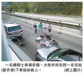 此时,一名身穿空姐制服的女子,与另一男子见状下车,为铁骑士急救,其中男子负责固定头部以纾缓伤者伤势,女子则为伤者检查。现场消息称,协助救人男子为圣约翰救伤队队员,女子所穿的空中服务员制服属香港航空,其紫色领巾代表职级为机舱事务长。救护员事後赶至接手,将清醒伤者送到明爱医院治理,其余两车上则无人受伤。