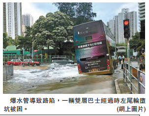 【香港商报网讯】记者冯仁乐报道:观塘协和街昨午发生地底水管爆裂导致马路下水土流失,一辆双层九巴驶经时因突然遇上路陷陷阱,其中一个尾轮堕坑即时被困,幸有惊无险,无人受伤,现场交通一度受阻,水务署派员展开抢修,预料工程要深夜才能完成。