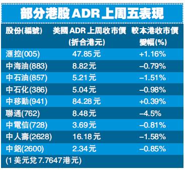 上周五港股美国预托证(ADR)个别发展,中海油(883)、中石化(386)、中人寿(2628)及中石油(857)较上周五香港收市下跌,惟中移动(941)及控(005)较上周五香港收市分别微升0.39%及1.16%。