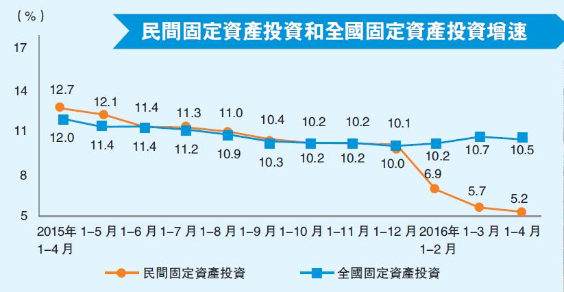 国家统计局的数据也证明了这一点,数据显示,今年一季度中国GDP实现了6.7%的平稳增速,各项数据也呈现出企稳回升的势头,其中固定资产投资85843亿元,同比名义增长10.7%。然而,在总投资回升的情况下,一季度民间投资的增速却出现明显下滑,总额53197亿元,同比增长仅5.7%,大幅落后於全社会固定资产投资5个百分点,比2015年全年增速降低了4.4个百分点。