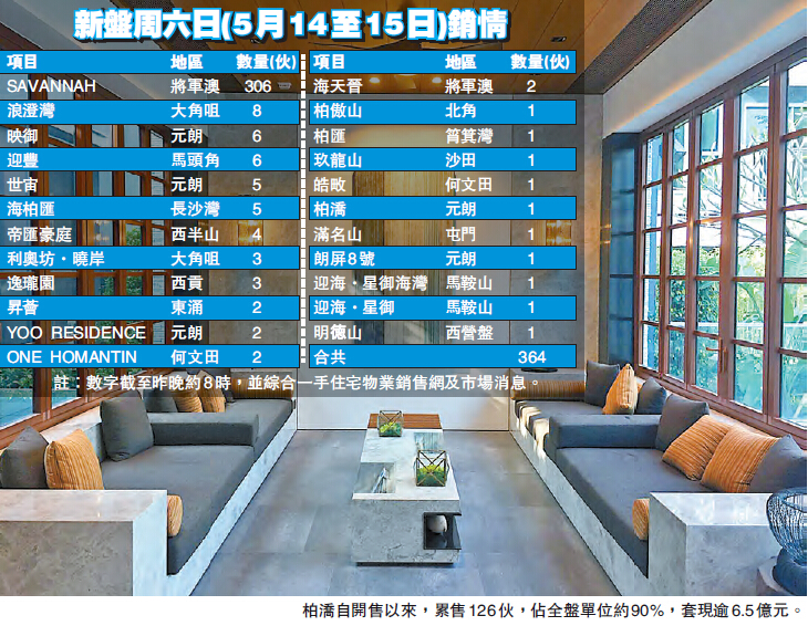 【香港商報网訊】記者曾浩榮報道:將軍澳新盤「SAVANNAH」主導了周末本港一手住宅市場!該盤上周六(14日)首日開賣即沽306伙,佔了過去兩日全港新盤成交的超過八成(詳見附表),並暫為今年單日售出最多伙數的新盤。發展商更透露,該項目約六成買家為80後及90後年輕一族。成功吸引年輕一族入市,某程度反映該發展商低市價及高成數按揭策略奏效。