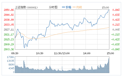截至收盤,滬指漲0.84%報2850.86點,成交1268億元;深成指漲1.55%報9910.08點,成交2351億元。