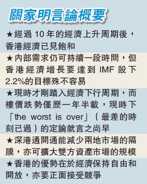 「香港经济放慢是自然现象。」关家明直言,香港当前经济的供给侧相当不足,人才不够,土地也不够;但2007年到现在,本港经济发展虽然有快有慢,惟一直保持增长,反映本港经济仍然稳健。