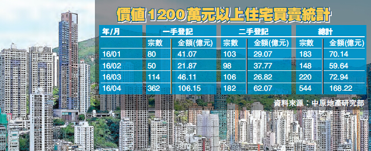 據中原地產資料顯示,上月全港共錄得544宗價值1200萬元以上的豪宅買賣合約登記,涉及成交金額為168.22億元,分別較3月份的220宗及72.94億元,大幅飆升1.5倍及1.3倍,同時創下自2015年7月後的9個月新高。若以一、二手數字比較,一手豪宅買賣表現相對「標青」,涉及登記宗數及金額,分別按年大增2.2倍及1.3倍,至362宗及約106.15億元。