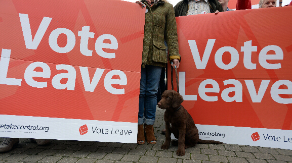 英国将于6月23日就是否留在欧盟举行全民公投。主张“脱欧”和“留欧”的两大阵营近期均加大游说力度,政、商界领袖人物纷纷登台拉票,双方交锋日趋白热化。当前,上述两大阵营的民意支持率不相上下,尚难预测公投结果。(完)图为5月11日在英国西南部城市特鲁罗拍摄的支持英国离开欧盟的标语。(图片来源:新华社)