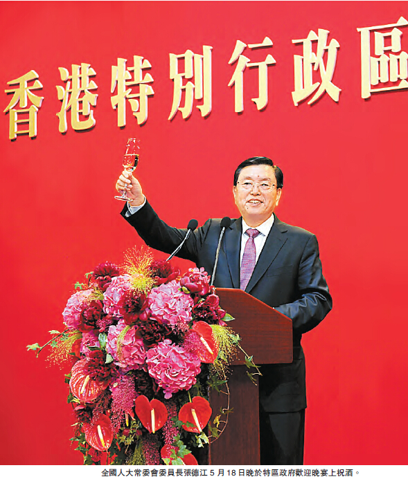 各位嘉賓、各位朋友,光陰似箭、日月如梭,香港回歸祖國很快就十九年了。在中央政府和祖國內地的大力支持下,特別行政區政府和社會各界,砥礪奮鬥、頑強拼搏,經受了種種考驗,為「一國兩制」成功實踐作出了巨大貢獻。十九年來,香港繼續保持原有的資本主義制度和生活方式不變,繼續保持國際金融貿易、航運中心的地位和社會大局的穩定,繼續被公認為全球最具競爭力的地區之一和最自由的經濟體。「一國兩制」和《基本法》,得到了包括七百多萬香港同胞在內的全國人民的普遍擁護,得到了國際社會的廣泛讚譽,這一切都來之不易,很值得自豪、很值得珍惜。