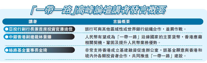 中银香港(2388)副董事长兼总裁岳毅指,香港作为国际金融、贸易以及航运中心,加上拥有「一国两制」的独特优势,可作为基建融资平台、中资企业国际化的跳板、离岸人民币资金和产品的提供基地、六大经济走廊建设的综合金融後台、贸易物流的连通枢纽、以及专业人才服务的聚集地。中银香港副总裁林景臻则指,人民币有望成为一带一路沿线国家主要货币,香港应藉相关规契机,巩固及提升人民币业务优势。