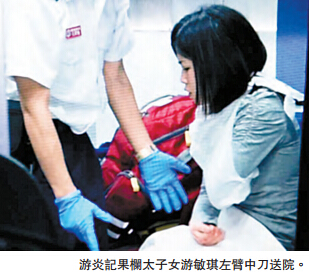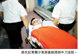 昨晚7时许,一辆7人车驶至窝打老道果栏对出停下,车上扑出5名持刀大汉,冲向游炎记内见人就斩,店内2男1女猝不及防,只能随手举起泡胶箱、纸皮箱负隅顽抗,最後全部均身中多刀浴血,其中男少东被割伤颈部大动脉,女少东据报有一只手指被斩至仅皮肉相连,而其丈夫则被斩伤头部。