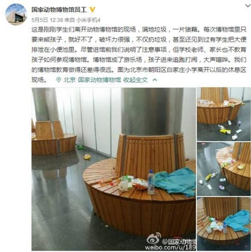 “每次博物馆里只要来熊孩子,就好不了,破坏力很强。”日前,科普大V“@国家动物博物馆员工”在微博写下以上文字,并点名批评北京一所小学,还放上当日该校学生离开博物馆后垃圾遍地的照片。稍后,被点名的小学昨天公开道歉,并对学生召开主题教育活动。