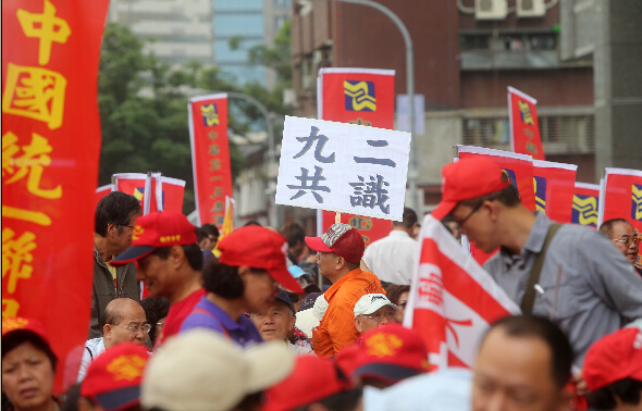 中华统一促进党等团体18日率众赴民进党中央,要求台湾地区新当选人蔡英文「坚守九二共识,维护两岸和平」。
