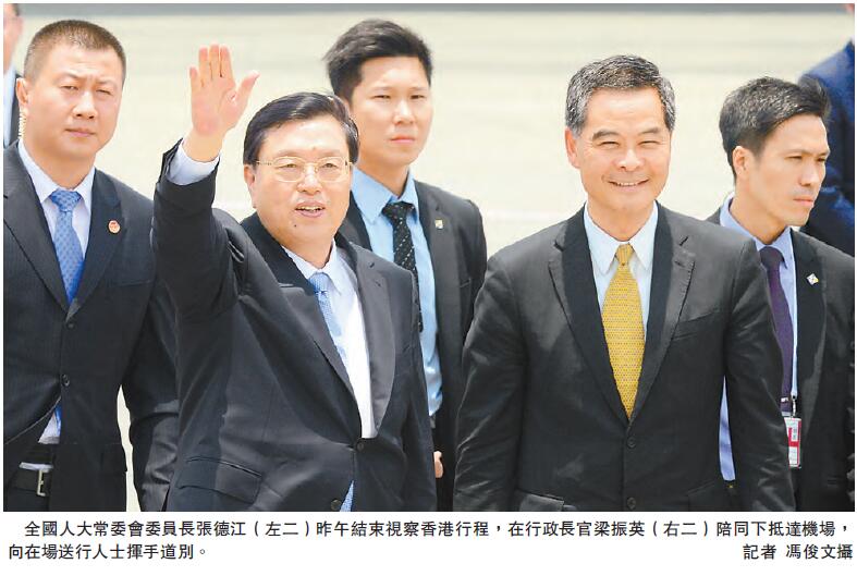 【香港商报网讯】记者李淇报道:全国人大委员长张德江结束视察香港3天的行程,於昨日中午乘坐专机离港,行政长官梁振英联同三司长及中联办主任张晓明等夹道欢送。张晓明随后在机场就张德江香港之行发表解读讲话表示张德江此行圆满,做到「看、听、讲」,除充分肯定及满意行政长官梁振英及特区政府的工作,又提醒香港社会明辨是非,坚守「一国两制」、《基本法》及法治底线;更充分显示「三个心」,中央对香港的关心、坚定香港人的信心和中央的决心。
