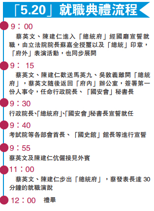 另外,马英九昨日会见前来参加蔡英文「5.20」就职典礼的美方祝贺团时表示,过去8年在「九二共识」下推动两岸和平发展,台湾海峡从冲突热点变成和平大道。他希望,两岸领导人能持续见面,用和平解决争端,让海峡和平永续发展。