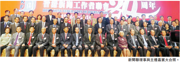 【香港商报网讯】记者吴韵玲报道:香港新闻工作者联会成立20周年庆典昨日假九龙洲际酒店隆重举行,行政长官梁振英、中联办副主任杨健、外交部驻港副特派员宋如安、基本法委员会副主任梁爱诗、教育局局长吴克俭、公务员事务局局长张云正及香港新闻工作者联会主席姜在忠、会长张国良、执行主席刘伟忠等出席主礼,逾700位嘉宾、新闻界友好欢聚一堂,场面热闹。