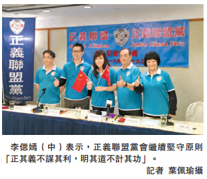 【香港商报网讯】记者叶佩瑜报道:正义联盟党早前闹出满城风雨,党主席李偲嫣昨日於记者会上重申,私人债务已还清,今後会继续经营该党,抱「正其义不谋其利,明其道不计其功」的原则,监督社会事务。除了委任新内阁外,她又宣布会定期发布政策文件、出版刊物、经营网台等。