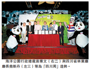 海洋公园行政总裁苗乐文及候任行政总裁李绳宗,昨联同四川省林业厅厅长尧斯丹、5位参展艺术家,包括中国大熊猫摄影家张志和、德籍华人艺术家张奇开、中国旅法艺术家田野、西班牙艺术家桑塔菲(Alejandro Santaf?)和法国艺术家巴山(Camille Roph?),出席「四川周」启动仪式,并首度公开播放一首由老狼演唱的大熊猫之歌《伴你回家》。