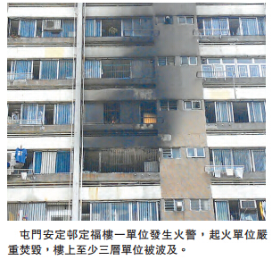 【香港商报网讯】记者冯仁乐报道:屯门安定一个塞满垃圾的单位,昨日凌晨闭门失火,严重焚毁,逾百住客睡梦中惊醒走火警疏散。消防员破门灌救近半句钟将大火扑灭,火警中有一名八旬老翁吸入浓烟不适送院。警方现列纵火案处理,正设法联络事发时不在家的独居拾荒妇协助调查。