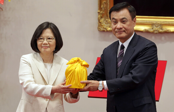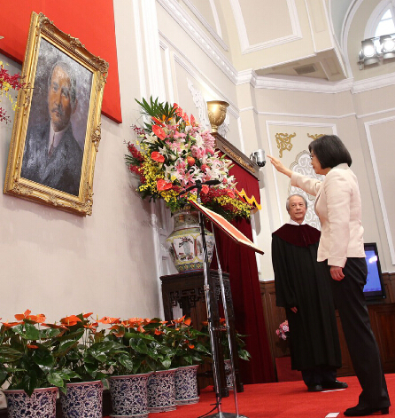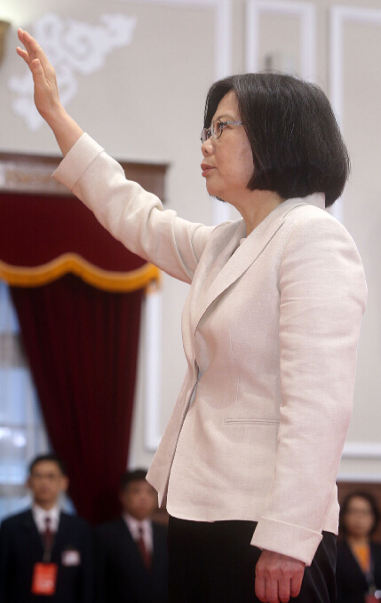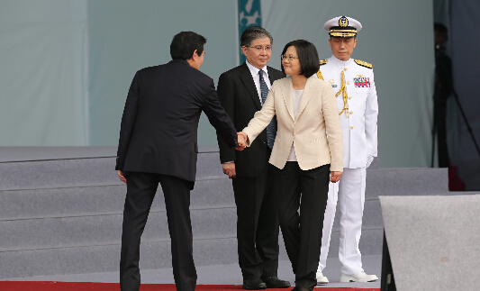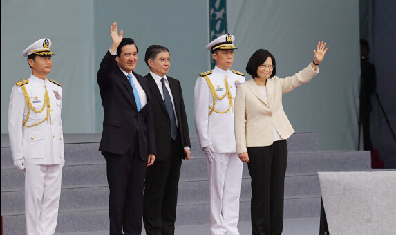 中国台湾地区14任领导人宣誓就职典礼5月20日在台北举行,卸任领导人马英九(前左)、新任领导人蔡英文(前右)进场,向民众致意。