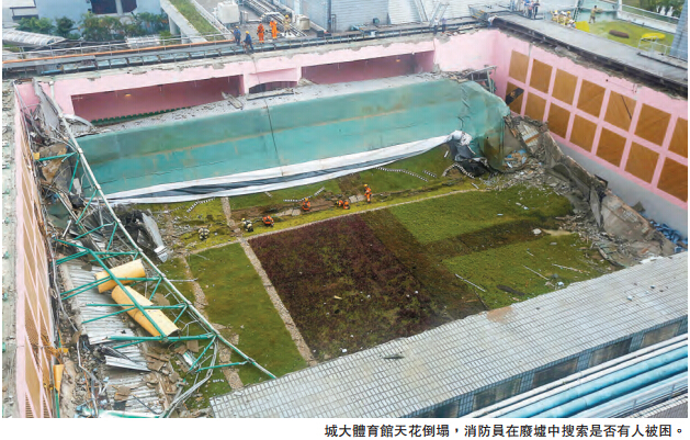【香港商报网讯】记者区天海报道:香港城市大学昨午发生罕见的严重塌天花意外。校内胡法光运动中心顶部一幅逾千平方米巨型天花,突然整幅坍塌,堕落下面的陈大河综合会堂,3名正在视察的场馆工作人员受伤,幸无性命危险。消防员事后出动坍塌搜救队搜索,证实无人被困。已落成20年的现场一向被安排用作大型活动项目用途,如果当时正举办活动,势必酿成严重伤亡。意外中仅有3人受伤,实为不幸中之大幸。