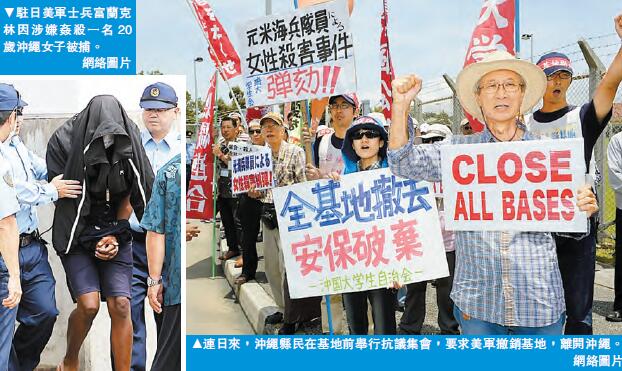 【香港商報網訊】美軍駐冲繩基地的原海軍陸戰隊士兵富蘭克林奸殺冲繩女子島袋里奈的案件持續發酵,日本防衛相中谷元昨日就事件向駐冲繩美軍最高長官抗議。而連日來,大批冲繩縣民眾也在美軍基地前舉行抗議集會,要求他們離開冲繩。分析指出,日本當局極不希望在召開G7峰會期間,冲繩出現大規模反美示威,所以才擺出對美強硬態度,但相信事件不會撼動日美關系。