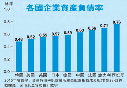 若将负债与资产作比较,去年内地企业的资产负债率为63%,而法国、意大利、西班牙企业的比率更高,西班牙达76%。陈德霖认为,由於内地股票融资市场还未发展成熟,企业融资仍以银行贷款为主,因此内地企业的资产负债率达63%不足为奇,他并认为内地企业资产负债率在国际上亦未算太高。