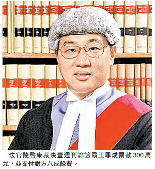 【香港商报网讯】记者万家成报道:中草药洗发水生产商霸王集团6年前入禀控告壹传媒旗下《壹周刊》诽谤,索偿6.3亿元,案件在去年8月底审结,高等法院昨日颁发书面判词,裁定霸王一方胜诉,《壹周刊》需赔偿300万元予霸王,另须支付霸王的八成讼费。有业内人士估计,霸王一方的讼费料约4000万港元,《壹周刊》除赔偿霸王的讼费外,连同本身需付讼费,《壹周刊》估计需支付双方讼费合共达8000万至9000万港元。