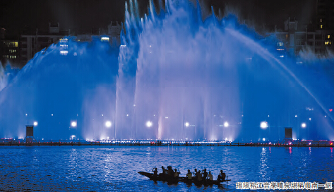 美妙的噴泉水幕、悅耳的音樂旋律、激情的激光電火,有機地融合在一起,將天幕渲染得流光溢彩,紅紅火火,精美絕倫。在第二篇章「沸騰榕江」以造型美觀的新型環保燄火,完美配合噴泉表演,營造出氣勢磅?、場面宏闊、震撼人心的立體音畫效果。隨著音樂曲調起伏,噴泉也不斷變化著形狀,曲越來越高,噴泉主噴一發沖天,高188米的國內最高主噴,激盪天宇,無比壯美!引得作家們不由得「哇~~」地讚歎出聲。