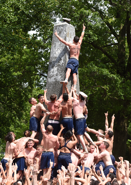 5月23日,在位于美国马利兰州首府安纳波利斯的美国海军学院,一年级学生攀爬赫恩登纪念碑。