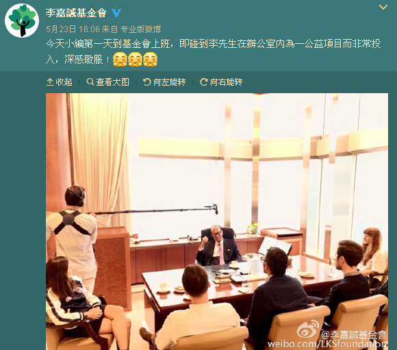 該微博寫到:“今天小編第一天到基金會上班,即碰到李先生在辦公室內為一公益項目而非常投入,深感敬服!”據悉,李嘉誠是為南通慈善博物館作準備工作。