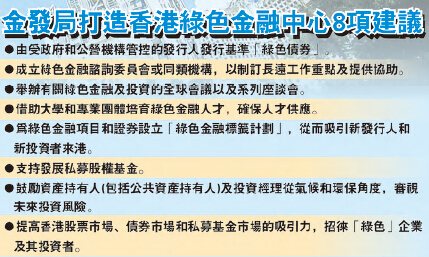 金發局報告就如何鞏固香港在綠色金融方面的領導地位提出8項建議:包括由受政府和公營機構管控的發行人發行基準「綠色債券」;成立綠色金融諮詢委員會或同類機構,以制定長遠工作重點及提供協助;舉辦有關綠色金融及投資的全球會議,以及一系列座談會;借助大學和專業團體培育綠色金融人才,確保人才供應;以及為綠色金融項目和證券設立「綠色金融標籤計劃」,從而吸引新發行人和新投資者來港;鼓勵資產持有人,包括公共資產持有人及投資經理從氣候和環保角度,審視未來的投資風險;提高香港股票市場、債券市場和私募基金市場的吸引力,招徠「綠色」企業及其投資者;以及支持私募基金發展等。發展綠色金融港具優勢