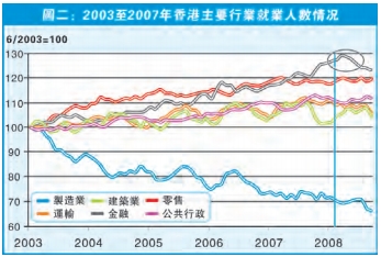 香港人特別關注零售業轉差,主因乃零售業是香港經濟的一大增長引擎;但以就業人口計算,全港共有75萬人從事金融業,多於零售業的62萬人。圖一亦見,金融與零售業的就業人數同樣在2014年第三季開始回落,至今跌幅雖未算嚴重,但趨勢明顯轉差。當零售與金融同樣下行,雖則失業率仍在低位,但看來逐步趨升已無懸念。