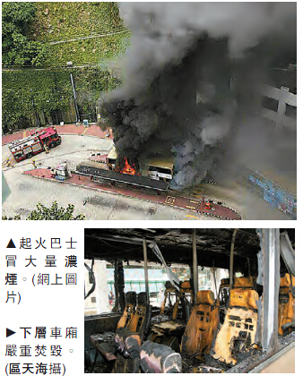 昨日下午2時許,該輛30號九巴突然冒煙,並隨即起火,車尾位置迅即陷入火海,大量濃黑煙升上半空,遠處亦可見。現場站長及多名車長見狀,先後取4支滅火筒救火,但並不成功,消防員接報到場,開喉灌救,迅即將火救熄。