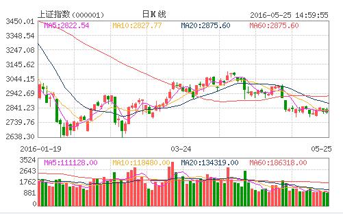 网易财经5月25日讯 今日,两市小幅高开后窄幅震荡,午盘后指数震荡下行并翻绿。截至收盘,沪指跌0.23%,报2815.09点,成交1178亿元;深成指跌0.38%,报9784.60点,成交2538亿元,两市成交量进一步萎缩。