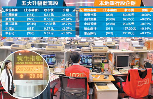 【香港商报网讯】记者韩濠昕报道:尽管承接欧美股市向好,昨日港股无以为继,轻微高开5点随即调头向下,走势颇反覆,幸好稳守在20天移动平均线(20200点)之上,其後跌势不断收窄,收市报20397点,微升0.14%,全日主板成交464.27亿元,本周恒指暂升2.74%。国企指数方面,昨日收报8526点,微跌0.12%,本周国企指数暂升2.68%。
