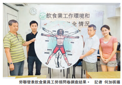 劳联於去年8月至今年1月进行问卷调查,总共访问322名从事饮食业的人士,发现他们平均每星期工作5.5日,平均每天工作8.9小时,而每天则平均须站立7.5小时。在肢体劳损方面,肩膀及腰部的劳损程度最大,其次则是颈部及膝盖。整体而言,有逾四成受访者表示,因身体的酸或麻痹症状已经明显地影响工作。